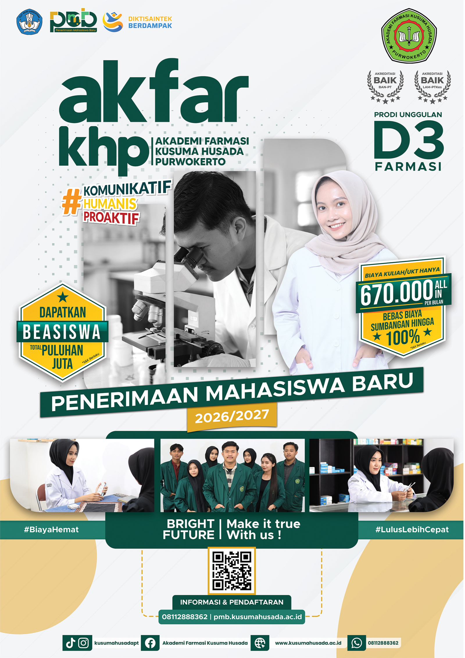 Akademi Farmasi Kusuma Husada Purwokerto (AKFAR KHP) merupakan perguruan tinggi vokasi yang membuka Program Studi D3 Farmasi dan berlokasi strategis di Purwokerto. Kami telah terakreditasi "BAIK" oleh BAN-PT dan LAM-PTKes, menjadi pilihan tepat bagi calon tenaga vokasi farmasi profesional. Sejalan dengan terbitnya Undang-Undang Kesehatan No. 17 Tahun 2023, yang menegaskan bahwa tenaga kefarmasian harus berasal dari lulusan pendidikan vokasi, AKFAR KHP hadir sebagai jawaban atas kebutuhan tenaga vokasi farmasi yang kompeten dan siap kerja. Tidak hanya fokus pada akademik, AKFAR KHP juga aktif menjalin kerjasama dengan rumah sakit, industri farmasi, dan berbagai stakeholder untuk mendukung praktik kerja, penyaluran lulusan, serta membuka peluang karir yang lebih luas bagi mahasiswa.